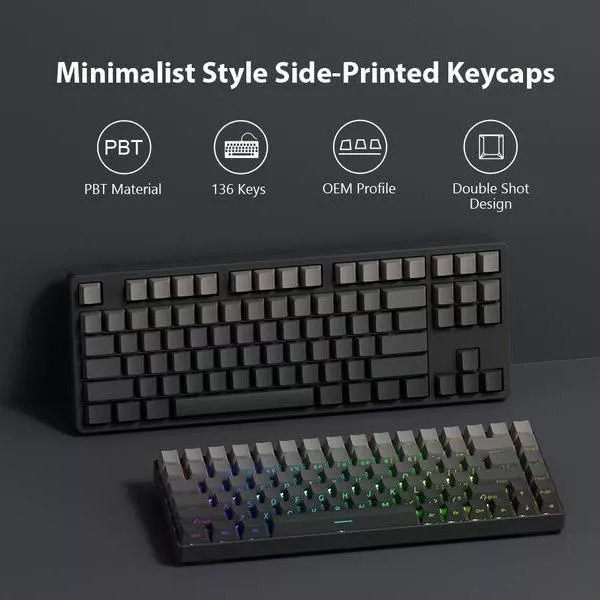 Our keycaps are crafted from high-quality PBT plastic, known for its durability and resistance to wear and shine. The double shot printing method ensures the legends never fade, maintaining a crisp, clear appearance through extensive use. With an OEM profile, these keycaps offer a comfortable typing experience, making them suitable for both gaming and professional environments. The side-printed legends, combined with a unique backlit design, create an elegant and understated look that stands out in any keyboard setup.