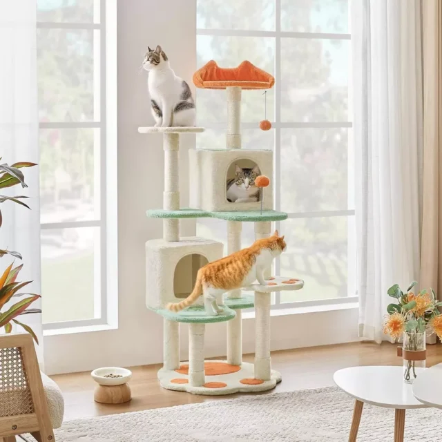 Give your feline friend the ultimate indoor playground with this 57.5-inch multi-functional cat tree tower. Bursting with personality, this stylish cat tower features a fun paw-shaped design in cheerful beige, orange, and green tones that will instantly brighten your home décor. But it’s more than just cute—it’s built for endless adventure, cozy naps, and healthy scratching.