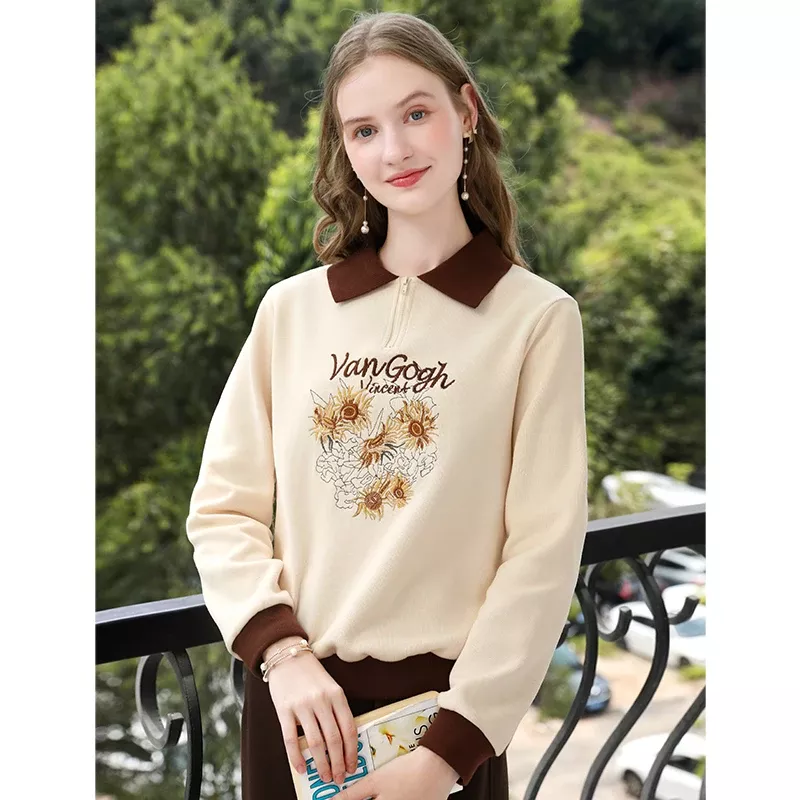 Apricot Sunflower Embroidered Pullover Sweatshirt for Women – Autumn Winter