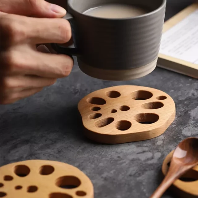 Crafted from solid beechwood, this drink mat showcases the natural beauty of the wood, complete with unique scarring patterns that add to its charm. The lotus root shape is not just aesthetically pleasing but also serves as a reminder of nature’s intricate designs. The irregular shape and the carefully crafted holes give it a rustic yet modern look, making it a perfect fit for any setting.