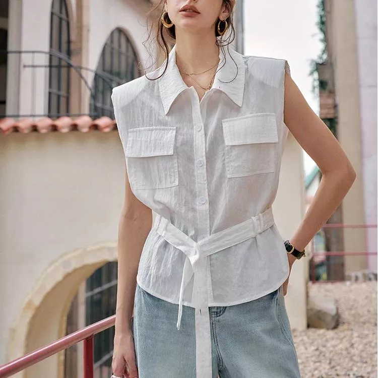 Chic Summer Belted Sleeveless Shirt for Women – Casual Solid Color Style