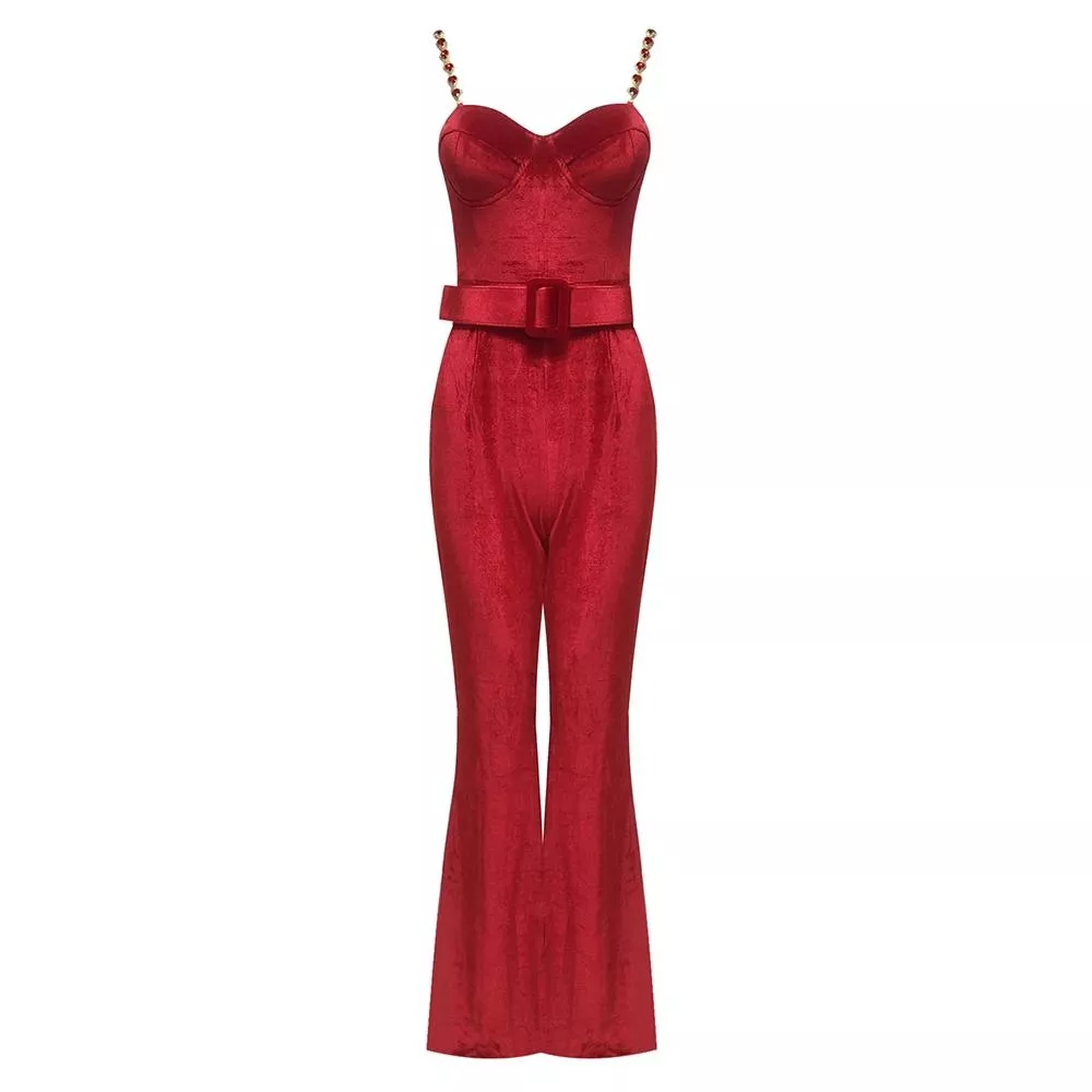 Red Velvet V Neck Flare Jumpsuit with Diamond Straps