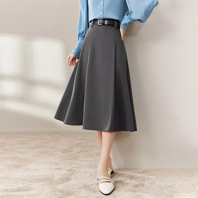 Elegant Gray Pleated A-Line Midi Skirt with Belt for Women – Spring Summer