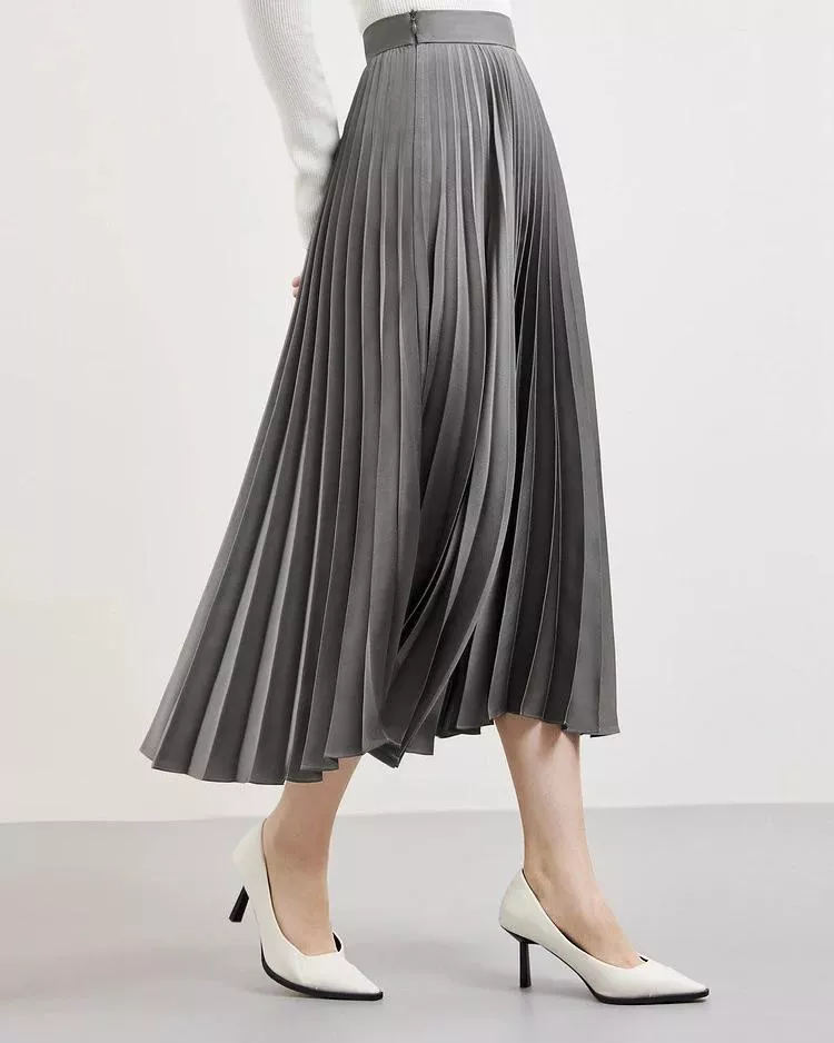 Elegant Gray Satin Pleated Midi Skirt for Women – Spring to Autumn Fashion