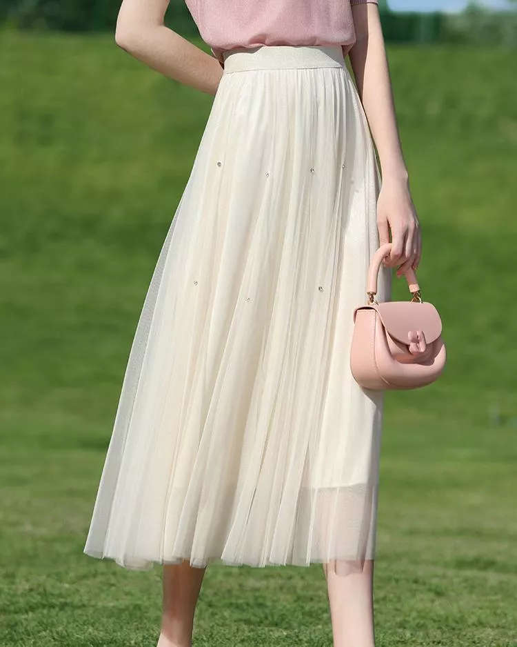 Elegant High Waist Mesh A-Line Midi Skirt for Spring & Summer
