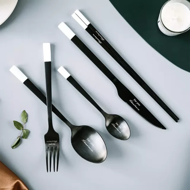 This cutlery set stands out due to its combination of elegant design, high-quality materials, and functional features. The black and white color scheme with printed letters adds a unique and stylish touch, while the 304 stainless steel construction ensures long-lasting durability. The inclusion of chopsticks in the set provides an extra element of versatility, catering to various dining preferences.
