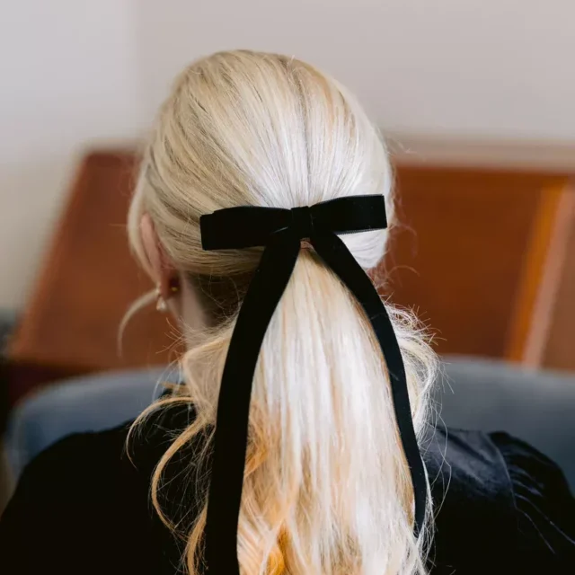 Featuring a luxurious black velvet fabric, the bow is designed with long trailing ribbons that drape beautifully down your hair. The secure clip makes it easy to style in seconds — just slide it in for an instant upgrade to your hairstyle. From loose waves to sleek ponytails and elegant buns, it adds a sophisticated flair to any look.