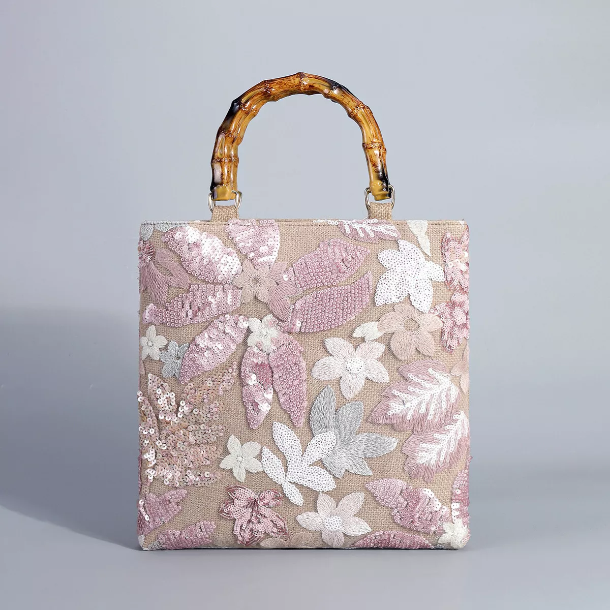 Sequin Embroidered Linen Tote Bag with Bamboo Handle – Summer Beach Purse