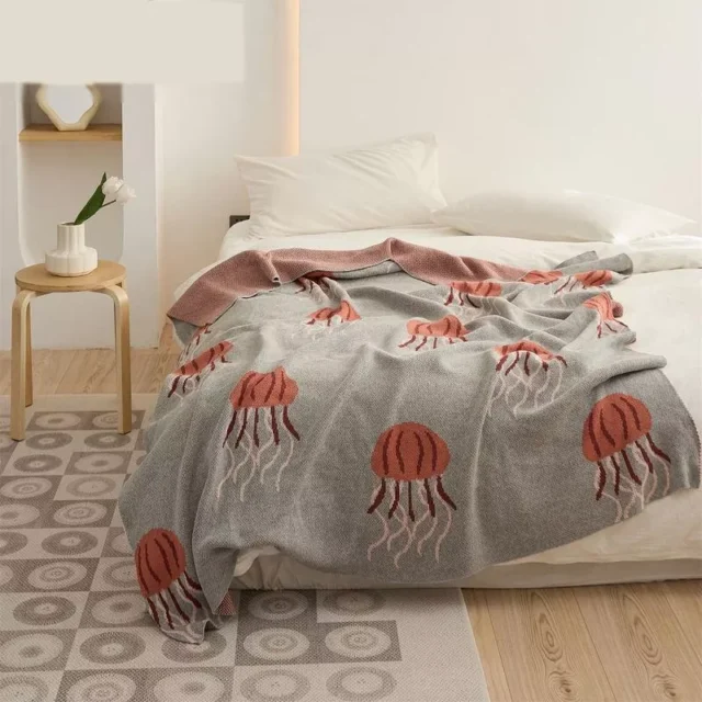 What sets this blanket apart is its unique jellyfish pattern, adding a cute and whimsical touch to any space. The jacquard style knitting technique not only enhances its aesthetic appeal but also ensures durability and longevity. The blanket’s anti-pilling feature keeps it looking new, even after multiple washes. Moreover, its OEKO-TEX Standard 100 certification guarantees that it is free from harmful substances, making it safe for you and your family.