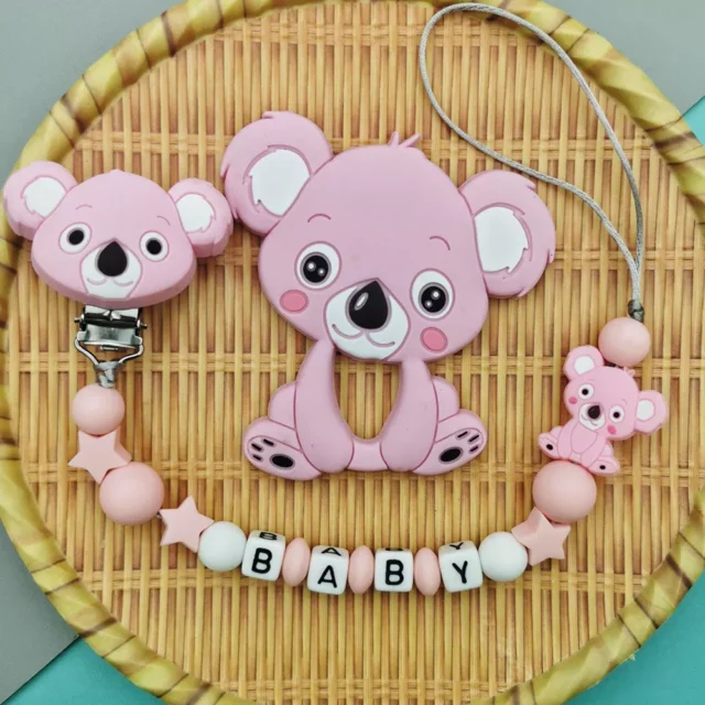 Keep your baby’s pacifier clean, close, and oh-so-cute with our Koala Silicone Pacifier Clip and Teether Toy. This charming accessory is more than just functional — it’s a personalized keepsake that brings a touch of fun to your baby’s daily routine. Designed with soft silicone beads, smooth acrylic letter blocks, and an irresistibly cute koala teether, it’s perfect for teething relief and preventing lost pacifiers — all in one!