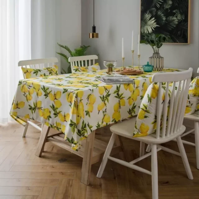 What sets this tablecloth and cushion cover apart is its vibrant lemon pattern that instantly uplifts the mood of any room. The polyester material not only offers excellent protection against spills and dirt but also serves as a beautiful decorative element that is both functional and stylish.