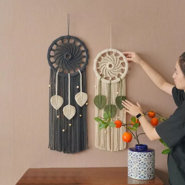 Add a touch of serene elegance to your living space with our Nordic Style Circular Hand-Woven Wall Tapestry. This piece combines traditional craftsmanship with a modern design, featuring delicate leaf patterns and charming tassels that bring a dreamy aesthetic to any room.