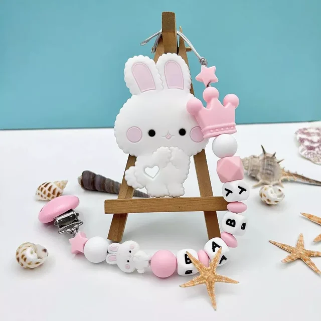 Give your little one something both practical and precious with our Silicone Baby Pacifier Clip with Name. Whether you’re looking for a heartwarming gift or an everyday essential with a personal touch, this baby pacifier clip stands out with its custom name beads. Shaped like a sweet bunny and designed with soft, baby-safe silicone, it’s a cute and clever way to keep pacifiers close and clean.