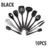 • Comprehensive Set: Includes spatula, basting brush, pointed spatula, round-edge turner, ladle, straight-edge turner, spoon, tongs, pasta fork, and more.