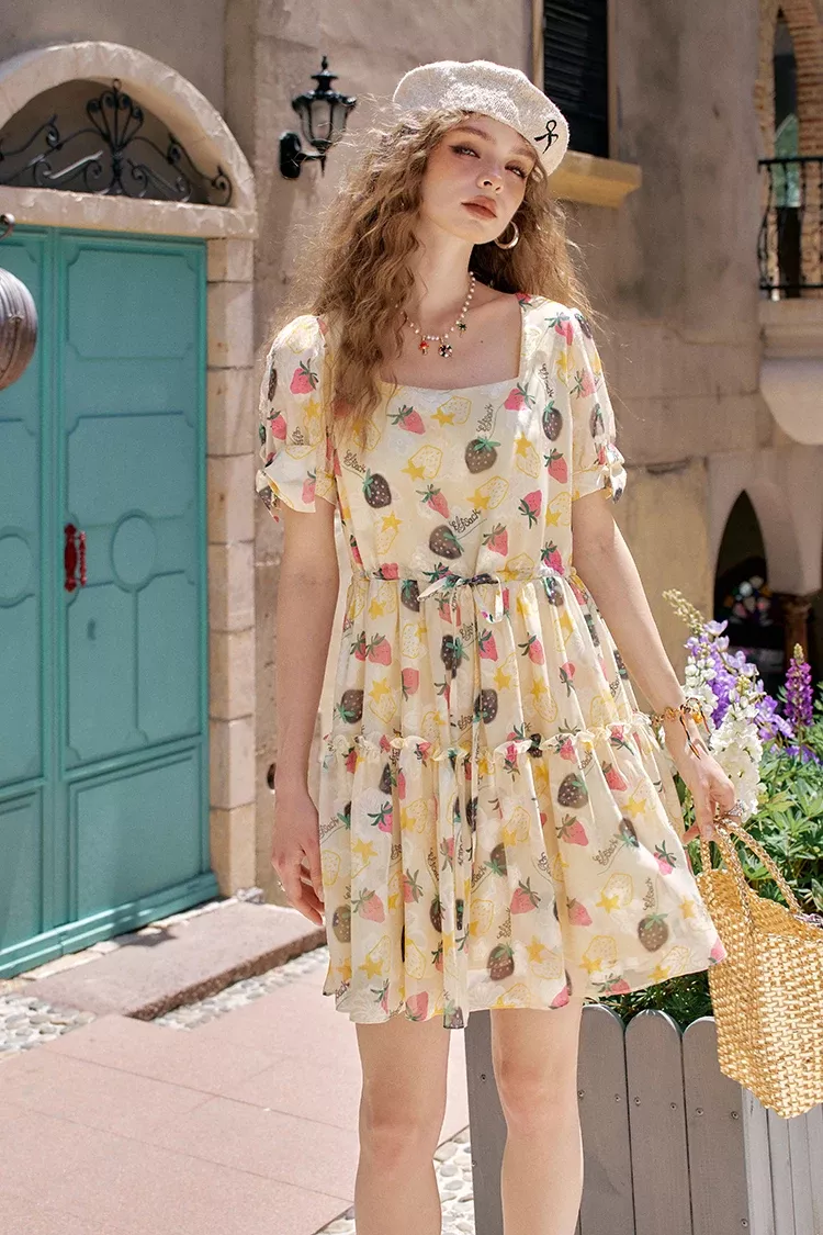 Strawberry Print Square Neck Dress – Summer A-Line Knee-Length Dress