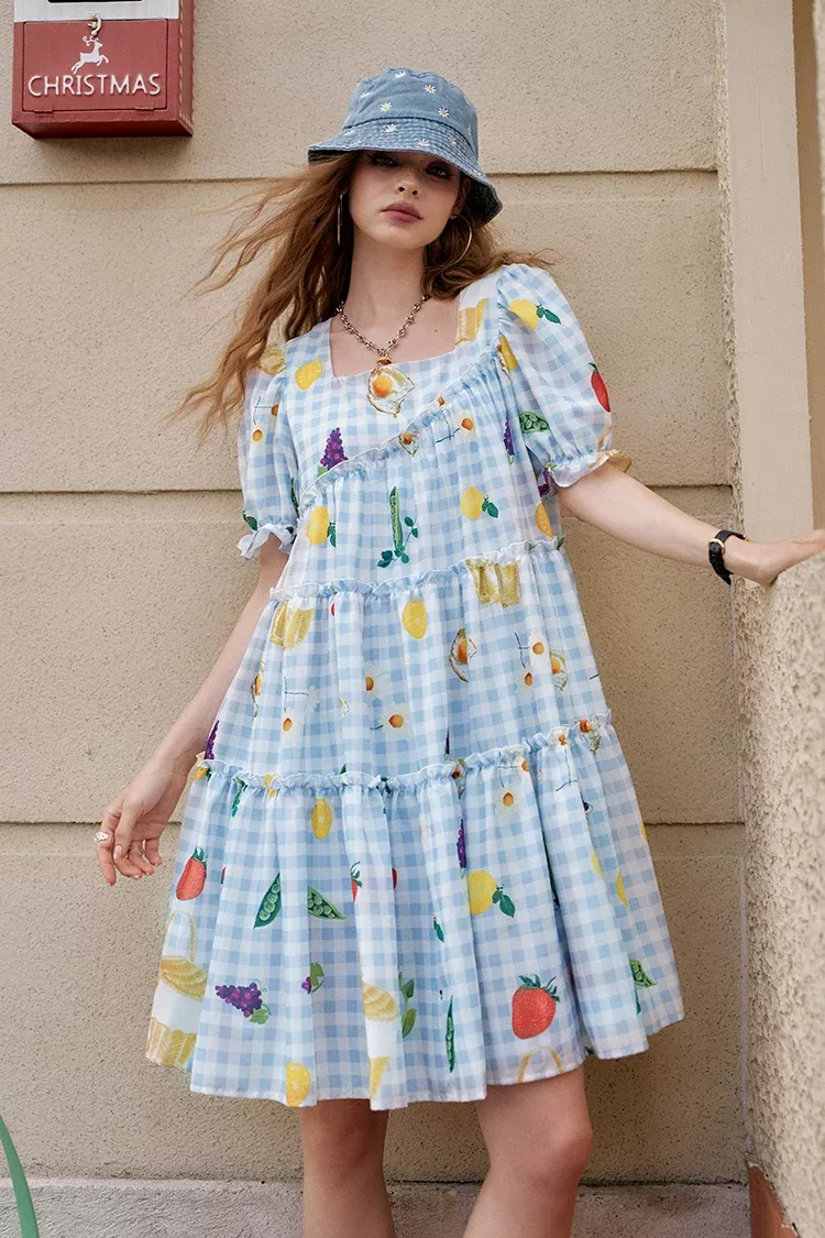 Turn heads with this adorably chic summer dress that blends classic blue-and-white gingham with juicy fruit prints for a look that’s sweet without being childish. The bubble sleeves add a trendy puff of personality, while the square neckline keeps it effortlessly elegant—perfect for everything from brunch dates to weekend adventures.