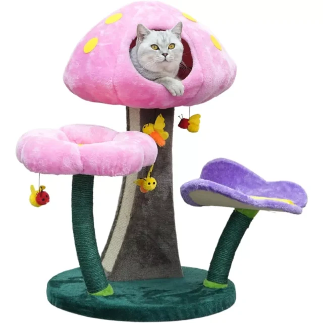 This cat tree offers more than just a resting spot. With a gentle flower-shaped cat bed, plush hammock, elevated lounging platform, and sturdy scratching post, it supports your cat’s natural instincts. Built from durable wood and featuring playful hanging bee toys, it’s an environment that stimulates curiosity while encouraging hours of play and rest. The soft, curved hammock cradles your feline friend like a gentle hug, while the top perch satisfies their love of height and watchful lounging.