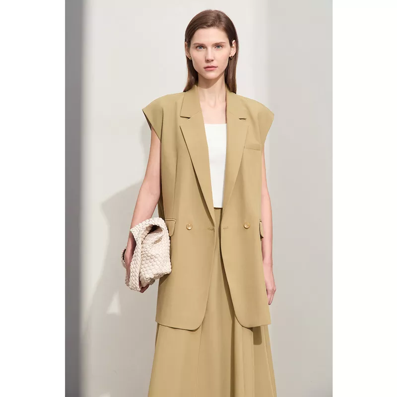 Crafted from a premium blend of polyester, viscose, and spandex, this vest jacket drapes effortlessly over your frame, offering a soft structure and just the right amount of stretch. The turn-down collar adds a classic touch, while the double-breasted closure and button details introduce refined charm. With its solid color and minimalist design, it’s the ultimate layering piece for spring and summer.