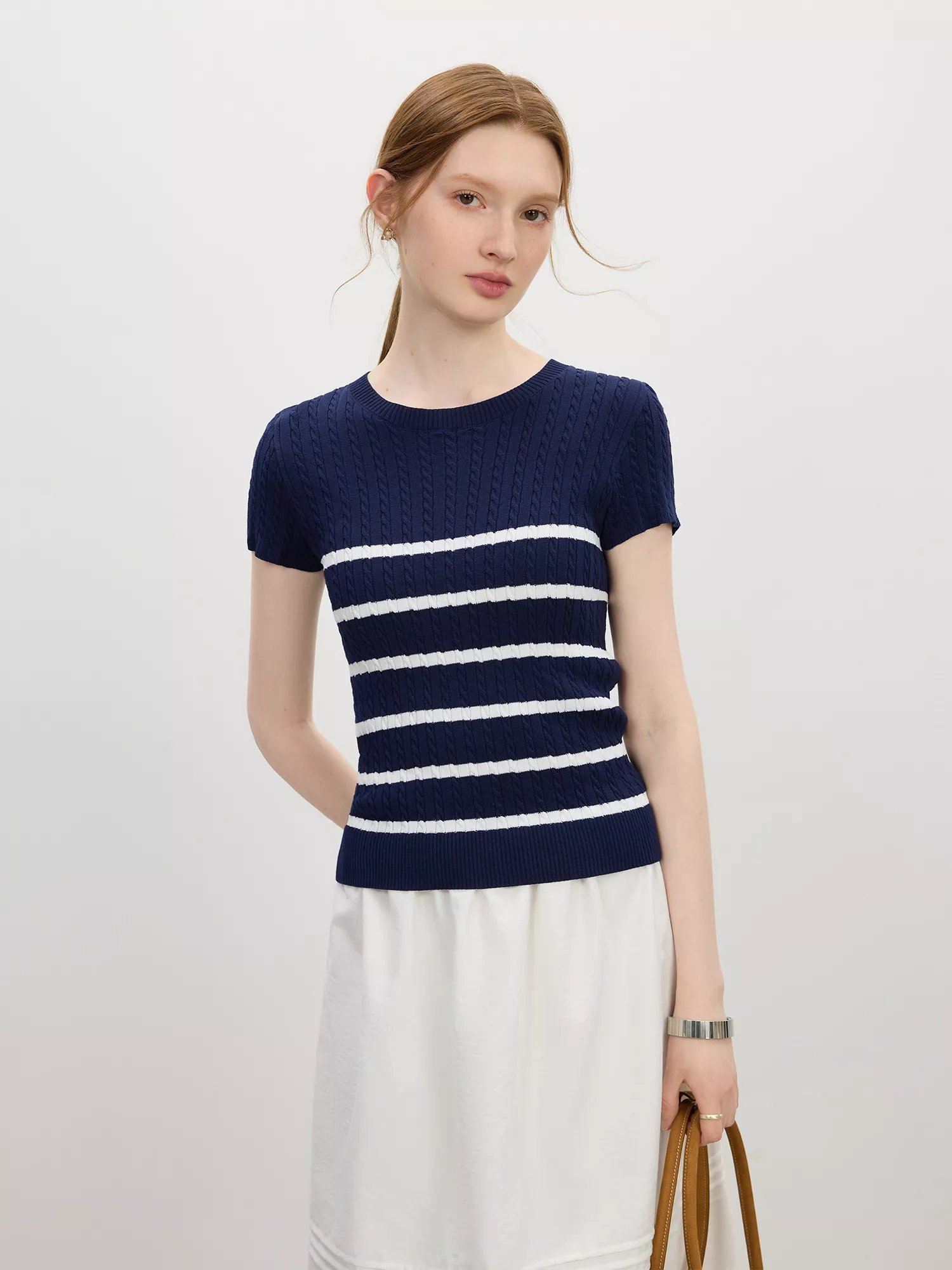 Crafted from a breathable blend of viscose (88.7%) and nylon (11.3%), this knit offers a soft touch against the skin with just the right amount of stretch to move with you. The short sleeves, airy knit, and subtle stripe pattern bring a relaxed yet polished feel. The pullover design makes it easy to throw on and go—no fuss, just fashion.